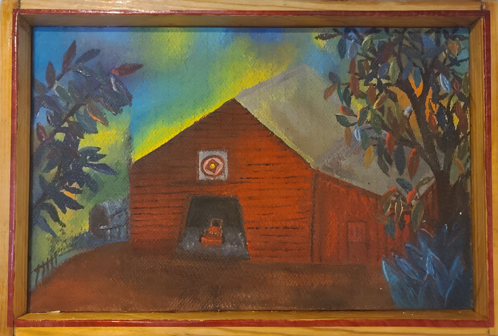 A pseudo-abstract version from a photo I took somewhere in the rural area of northern Virginia. The challenge here was painting it on a rough surface. It can’t be seen in the photo here but, in reality, it provides an interesting effect and depth to the painting.