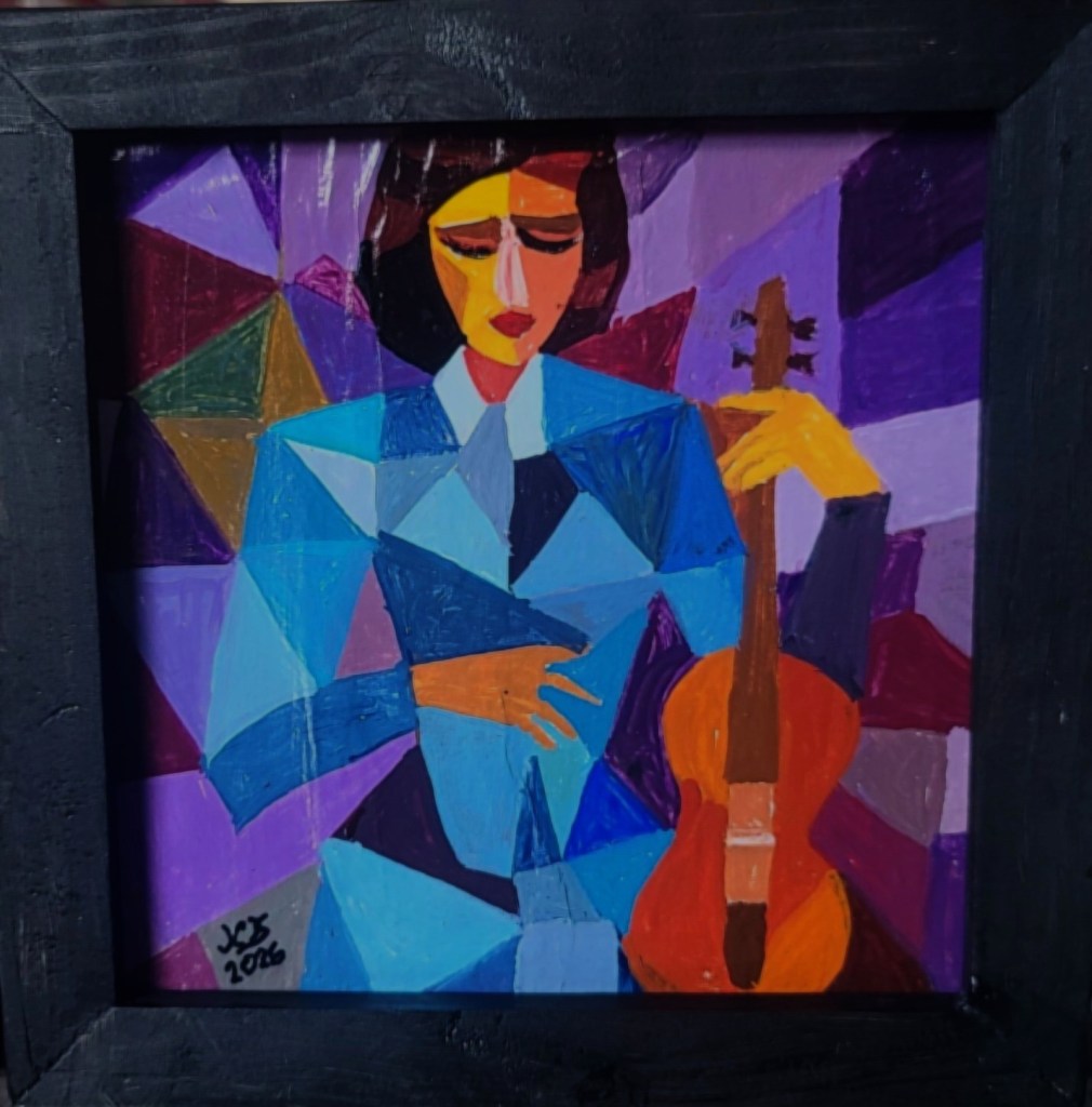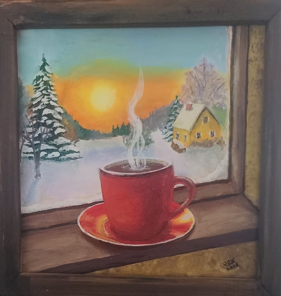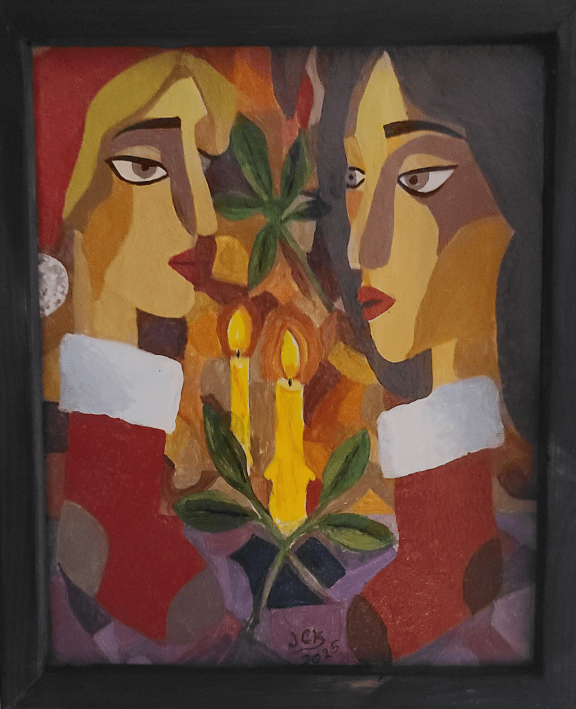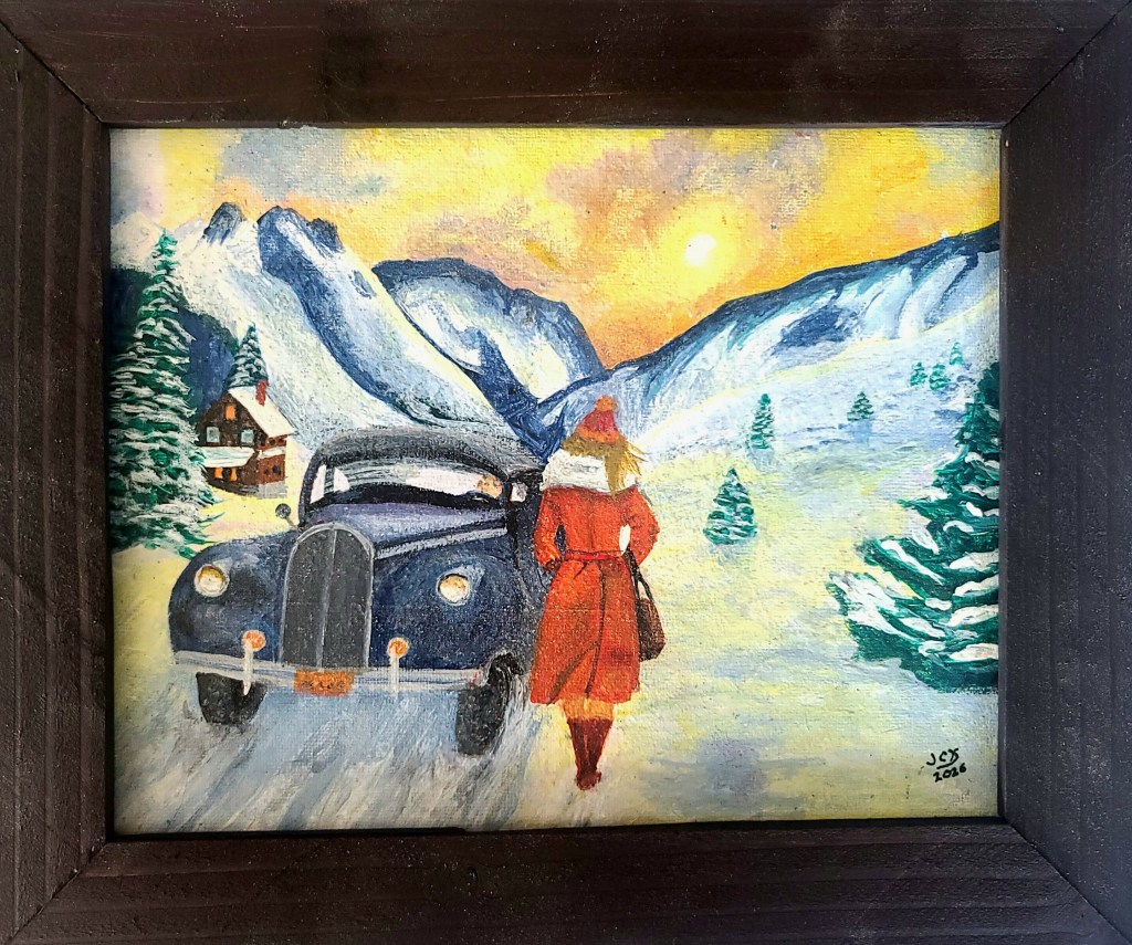 With the latest trend being Artificial Intelligence (AI), I decided to utilize it to create a concept using my text input. I typed in a number of Christmas words and selected an art style and it came up with the master of what I used to create this. I introduced my own modifications while painting it and selected my own colors. This result may be my most ‘artistic’ piece I’ve created to date.