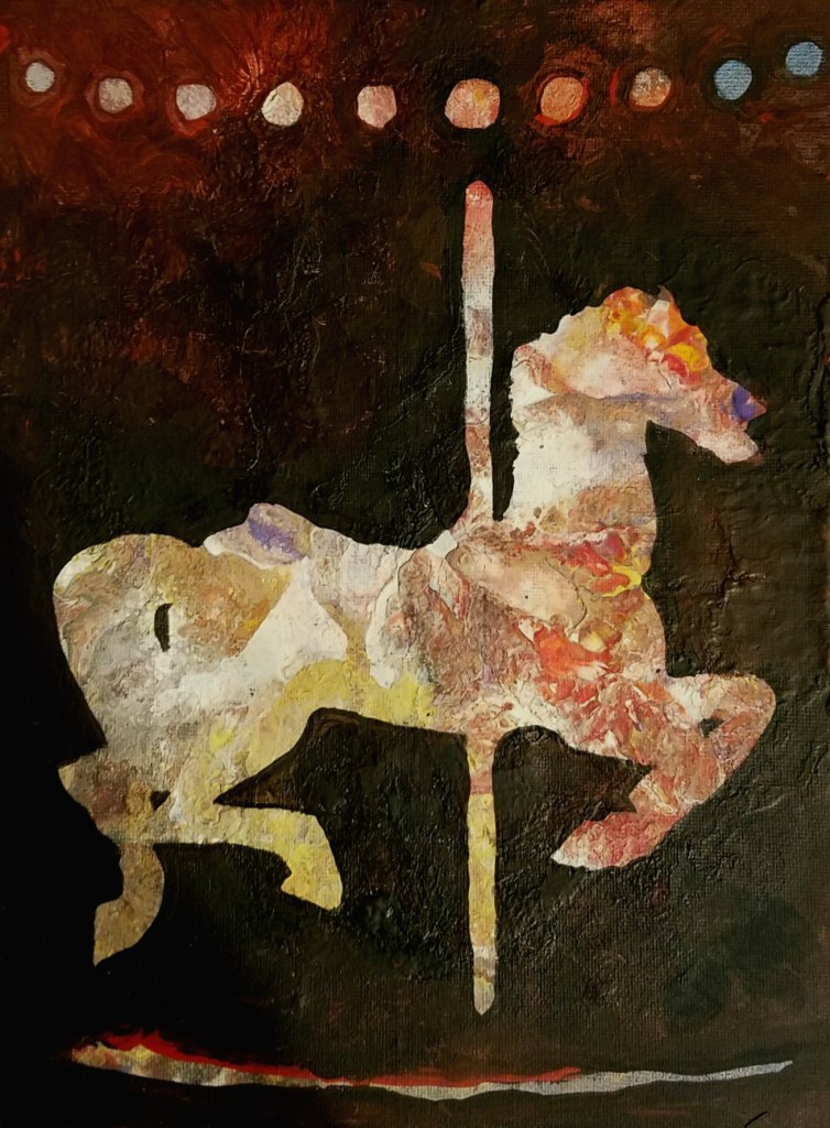 Started out as a vision I had of a farm house at dusk in October with pumpkins on the porch and an old Ford truck in the drive. Fail! Then decided to do a pour painting over it using a sink strainer … since there’s apparently a great shortage of sink strainers, I put a bunch of holes in a plastic cup and gave it a whirl. Fail! Then I stared at the mess I created, stared more and then a little more. Carousel jumped out at me. Walla! So here it is … October Farm Pour Carousel!