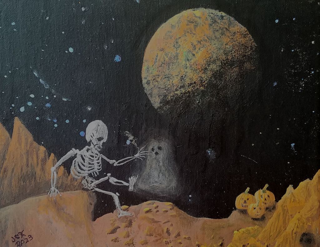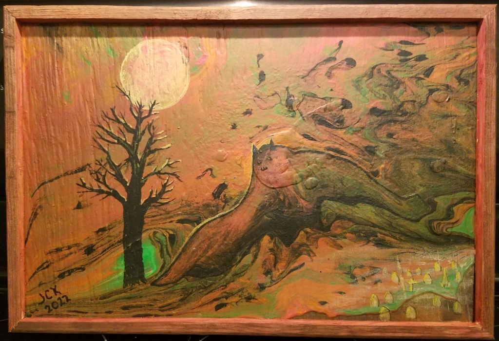 Another random pour painting that spoke to me. It said “I’m a bat”. So, I outlined him and added a few features and then added a tree, the moon and a graveyard.