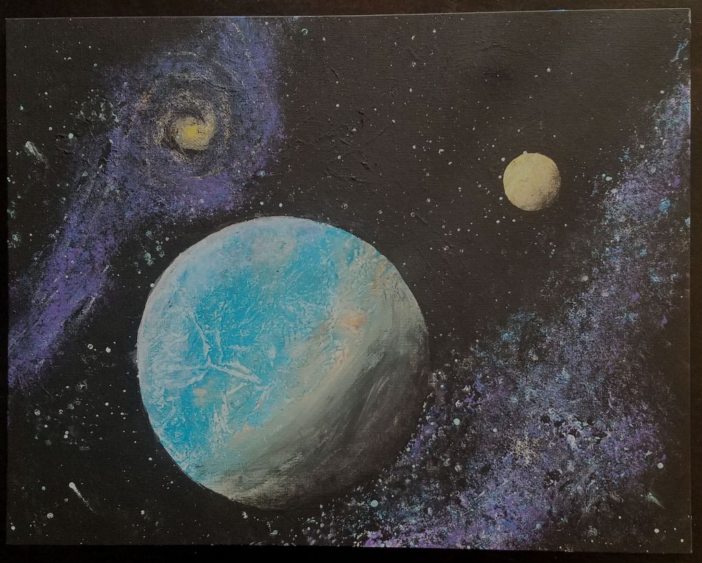 I’ve seen space paintings and watched how-to’s using spray paint. I tried it myself with okay results. But, I wondered whether you could do it using acrylics rather than spray paint. I was pleasantly surprised that it came out as it did and is actually one of my favorite creations. I also think it looks better in real life rather than the picture of it used here.