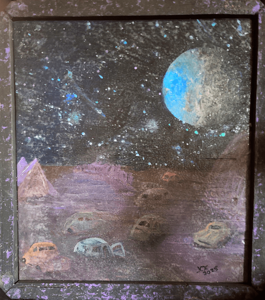 I’ve kind of gotten hooked on doing “space paintings”. I wanted to do something different though. No idea where, but the idea came to me of a bunch of old cars on a planet. I had one issue along the way. I put a matte varnish on and for some reason it didn’t dry completely clear which degraded the painting some. Also, for this one, I couldn’t get a photo to put here that captures it properly – I think it looks better in person.