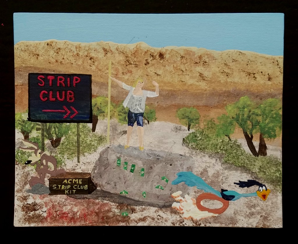 Pic of Melissa standing on a rock in the Nevada desert I wanted to paint. Thought it needed a bit more subject matter and the answer was obvious. This is the result. Not my favorite or best execution, but I love the concept!