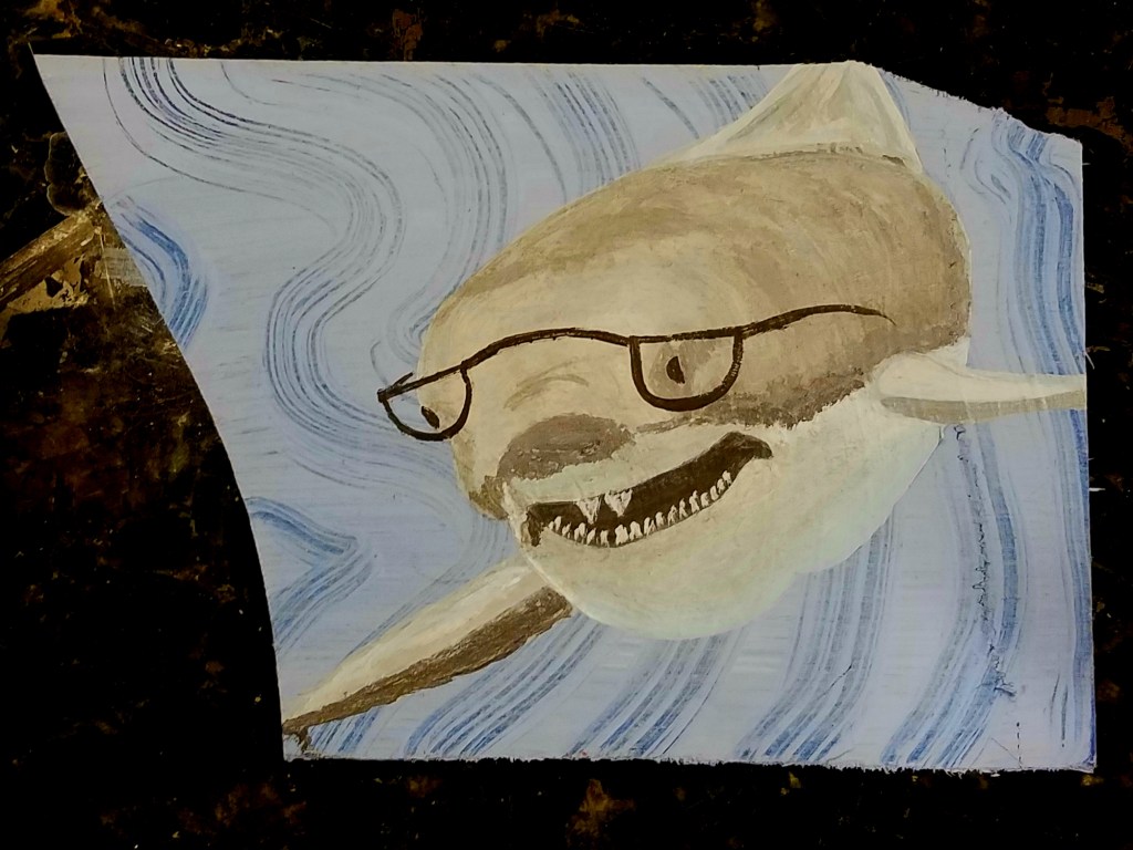 This is what happens when you experiment with a new painting technique on a scrap piece of wood that doesn’t quite work. Did what any artist would do … painted a Nerd Shark!