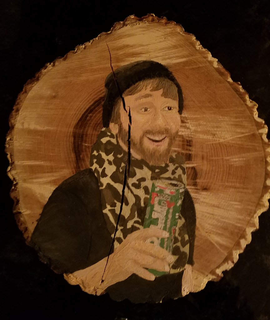 Done as a gift for John’s 30th birthday. So classic John and I think I captured him pretty accurately. Unfortunately, the wood cracked partially through … my brother said “he must be a crackhead”. With that, I decided to finish it and that the crack just added character.