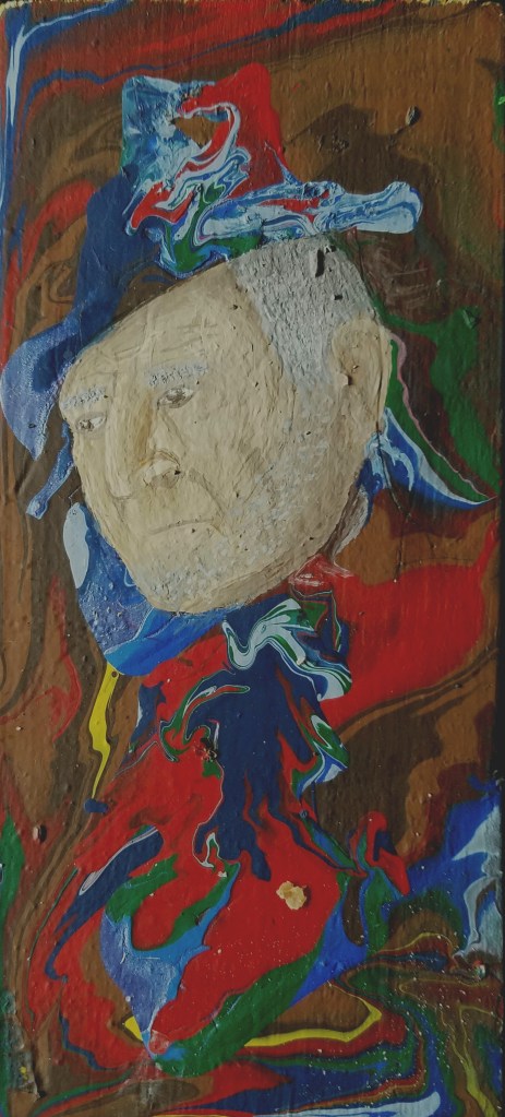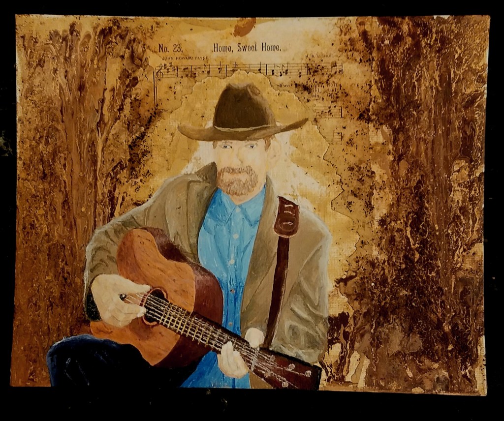 My first painting inspired by something in the creases of my brain. Experimental background using a mixture of oil, coffee grounds and acrylic paint with an antiqued partial music sheet soaked in a glue/water mixture. Used a reference photo of some old country musician but created the dude from my own head.
