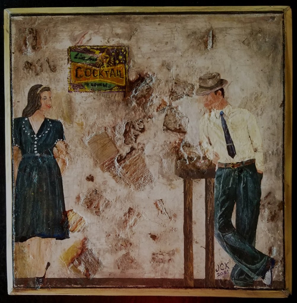 This is “Mr. Suave” Vern in October of 1948 eyeballing Valerie for the first time in a dive bar. The rest is history! I call this my “kitchen sink” background made from scraps of wood and sawdust from the garage floor mixed with spackling, glue and some old stain. One of the most challenging pieces painting on a very rough surface.