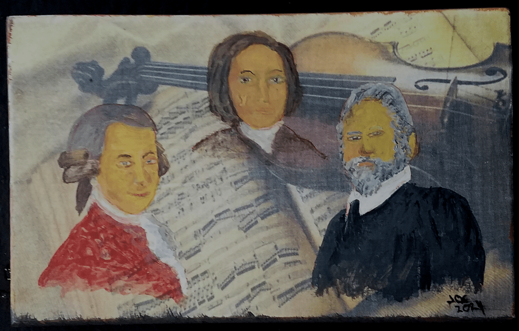Okay, the title is not actually accurate. This is another addition to my ‘bathroom painting’ collection and I had to include something representing classical music. I downloaded the background and pasted it onto a board and painted three composers. I choose Pachelbel as Pachelbel’s Canon is one of my favorite (and just about everybody’s) piece, Mozart for his genius, music and character and Tchaikovsky who is probably my favorite composer. The resemblances aren’t actually all that bad but, without knowing the theme, the title represents what my interpretation would be!