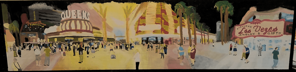 From a panorama photo I took on Fremont street in Vegas with Melissa in the middle surveying all of the bright lights and action. This took quite a while to do but really enjoyed working on each aspect and piece of the scene.