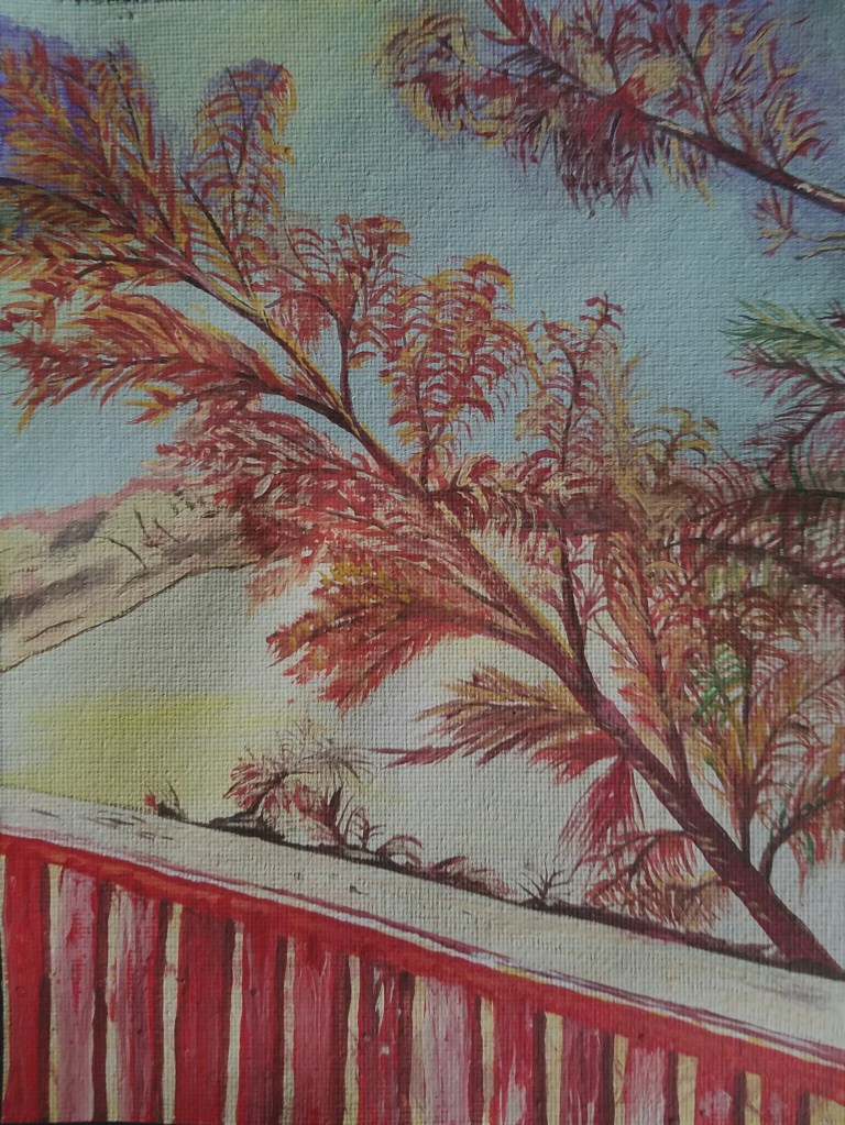 A pseudo-abstract version from a photo I took somewhere in the rural area of northern Virginia. The challenge here was painting it on a rough surface. It can’t be seen in the photo here but, in reality, it provides an interesting effect and depth to the painting.