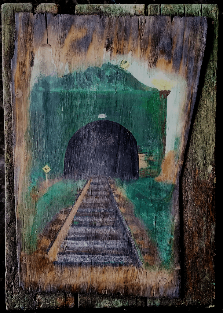 Continuing with my bathroom project and theme (see ‘Loco Motive’ painting), I applied all kinds of effects to a photo I took of the Northern end of the train tunnel at Point of Rocks, Maryland which we see whenever we walk on the C&O Canal Towpath. I used some old wood pieces I assembled together some time ago as the ‘canvas’.
