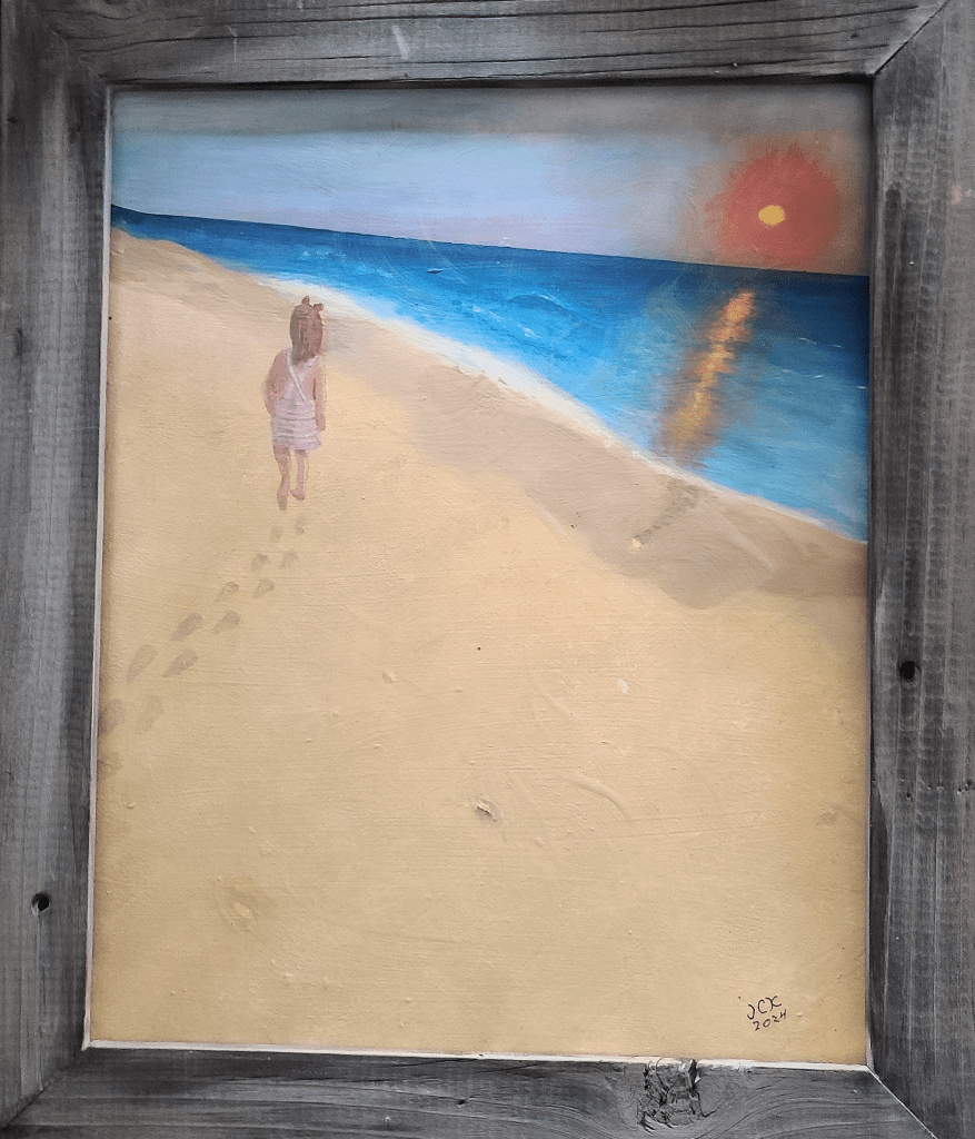 Chatting as we usually do with my long time dental assistant, somehow the subject of my painting came up. I showed her a few samples and she asked if I could paint from a picture she had of her daughter walking on the beach. It took a while but I finally finished it. I’m not very pleased with it and think I took on more than I’m capable of doing at the current time. But, you only get better if you keep painting – which I will!