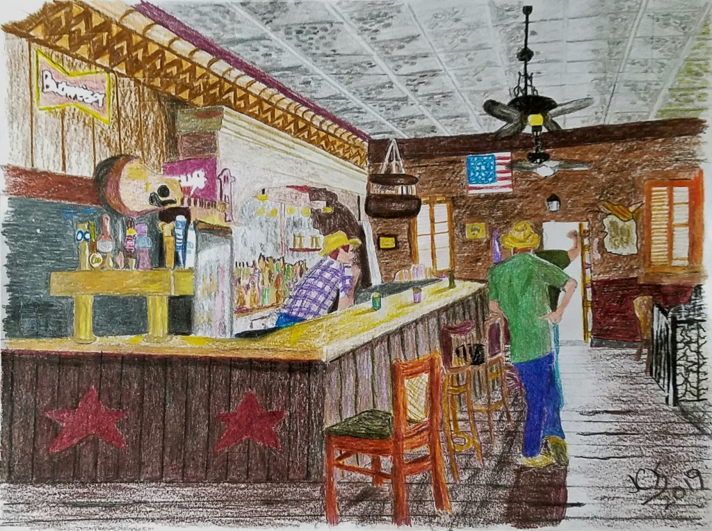 Colored pencil drawing of an afternoon conversation in the Pioneer Saloon in Goodsprings, Nevada.
